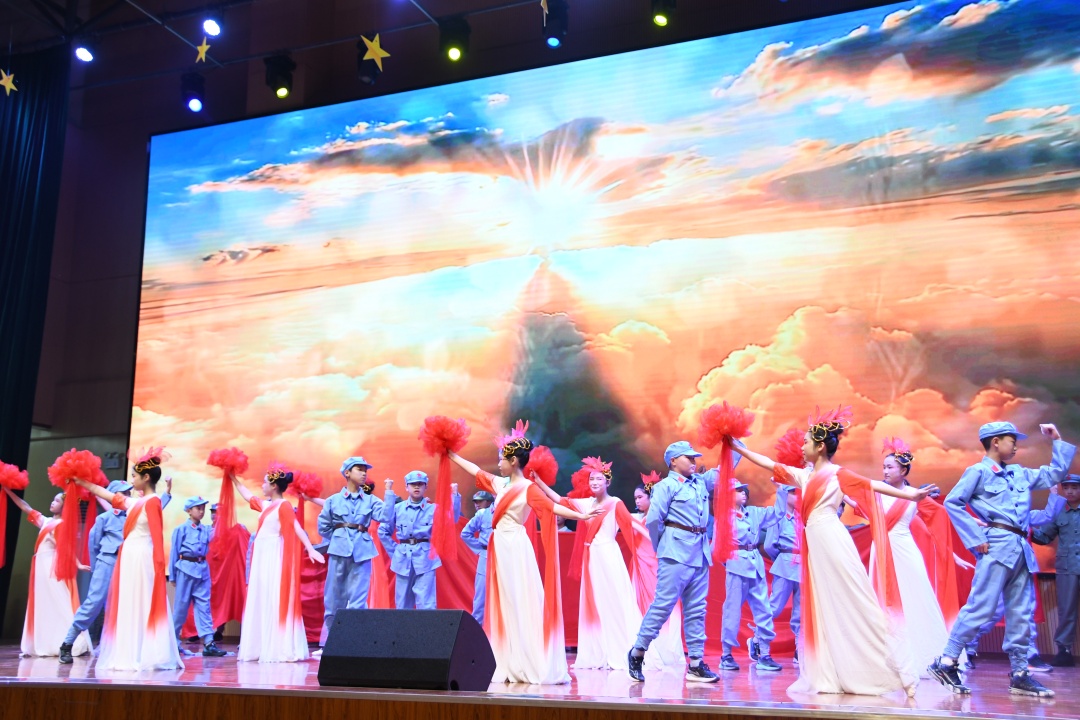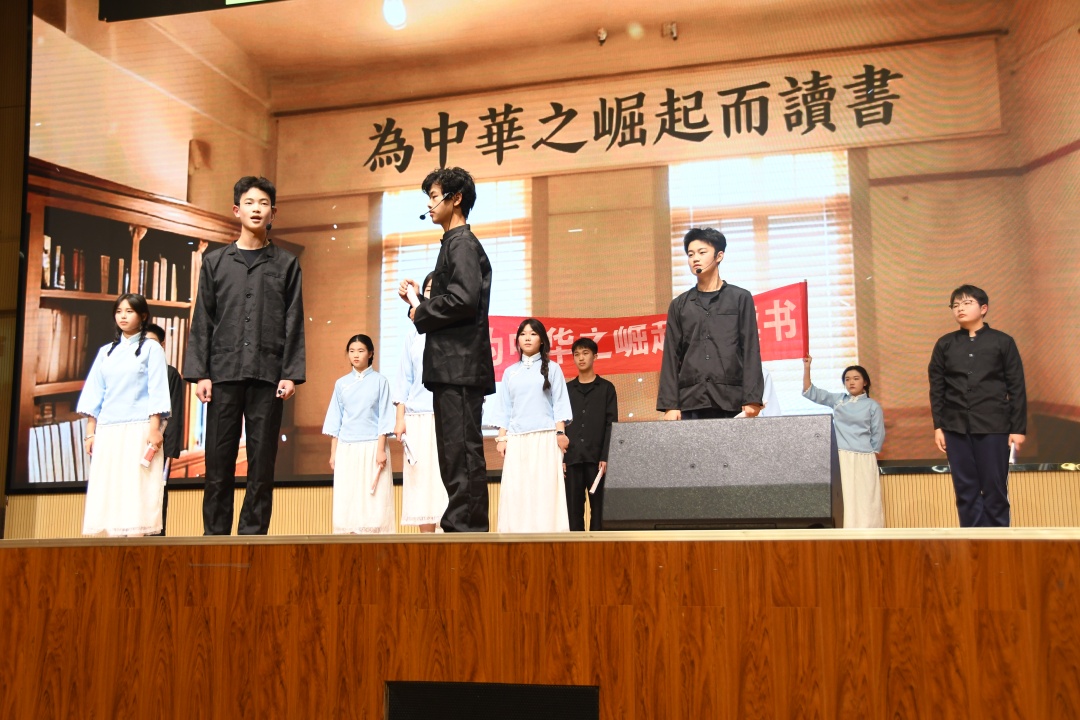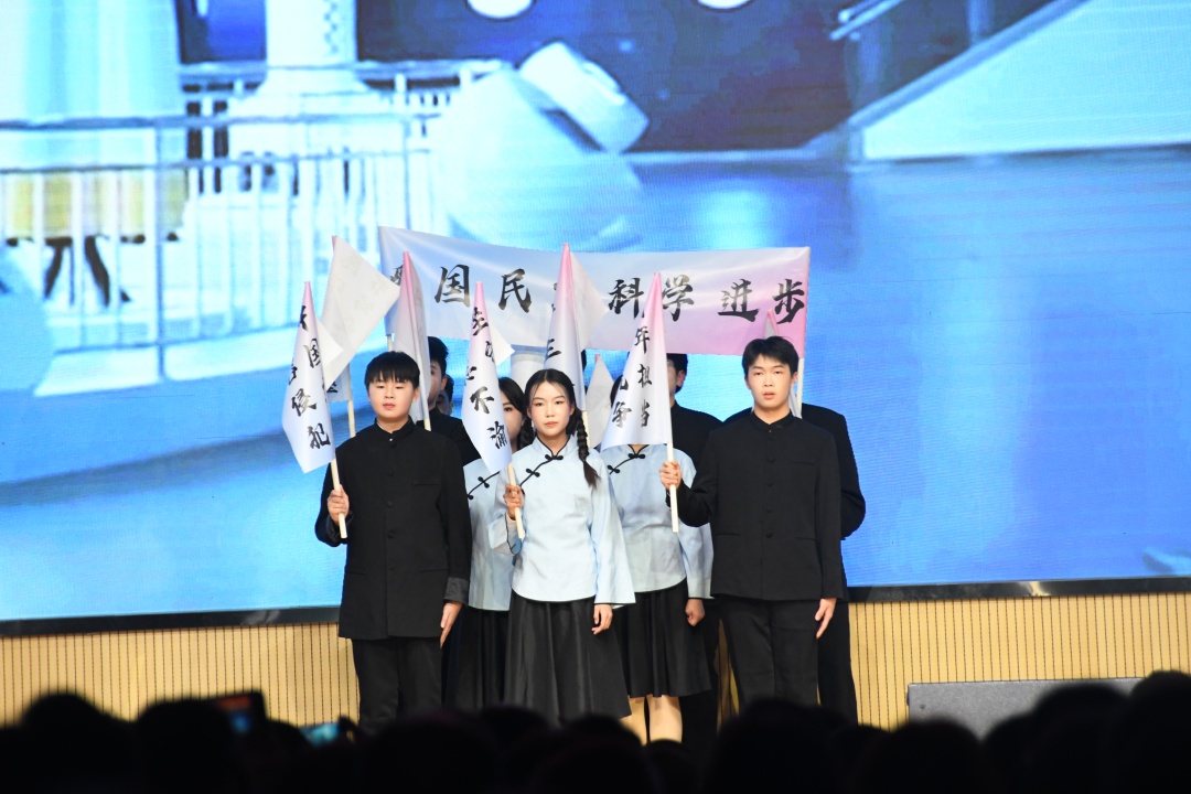 汇演尤为引人注目的是对中华优秀传统文化的创新演绎与深情礼赞。校武术队的《九紫武术之武动乾坤》刚柔并济,一招一式尽显中华武术的博大精深与少年英姿。2407班的《鼓震山河·狮舞华章》更是气势磅礴,震天锣鼓与欢腾舞狮交织,不仅烘托出浓浓的年节喜庆,更展现了传统文化在新时代少年手中的活力传承。2510班的《望人间种遍自由花》以艺术手法缅怀先烈,传递对自由与和平的珍视;2410班的《百年回响,科技之光》则聚焦科技报国情怀,致敬一代代科学家的奉献精神,激发着观众的爱国热情与创新志向。