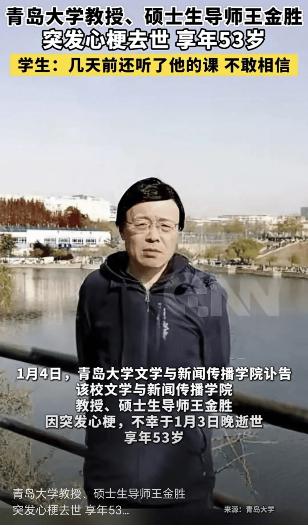据极目新闻1月5日报道,青岛大学文学与新闻传播学院王金胜教授,因突发疾病于1月3日晚去世。
