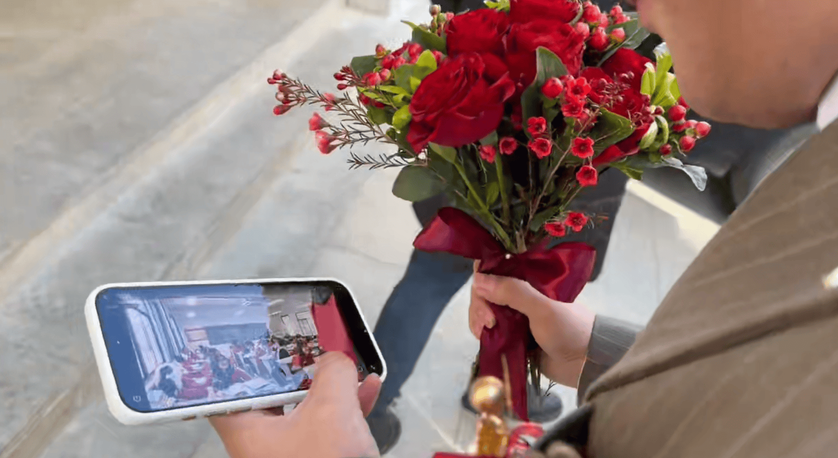 “当天在迎接新娘前,我发现新郎正拿着手机,嘴里还念叨着什么。”作为伴郎,当天王先生一直很关注新郎,起初,王先生以为新郎是因为结婚紧张,“后来看到他突然一个人站在原地,手上拿着鲜花和手机,嘴里面在说点什么东西。我上前一看,发现他正在和视频监控中的学生进行交流,并叮嘱他们好好上课。”